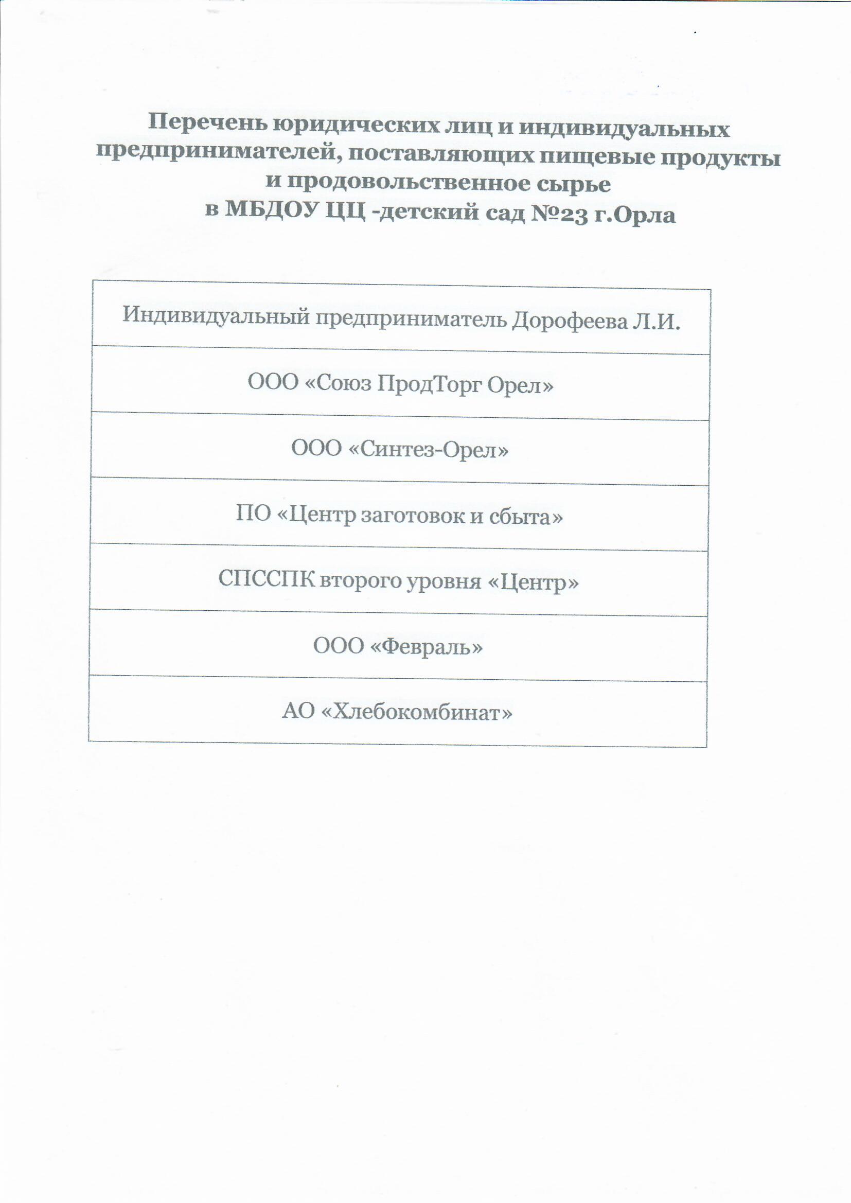 Перечень юридических лиц и индивидуальных предпринимателей, поставляющих (реализующих) пищевые продукты и продовольственное сырье